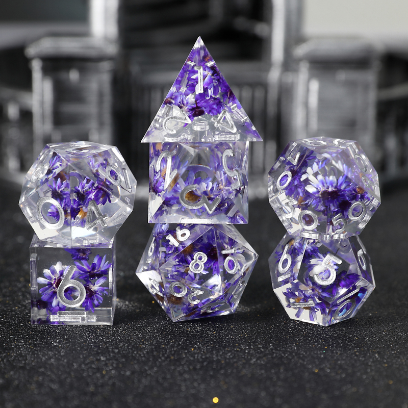 The dice feature a highly transparent, crystalline resin body, allowing for an unobstructed view of the intricate floral details and layers. The numerals are finished in a brilliant silver, providing a sharp, clear contrast against the elegant purple blooms and adding a touch of sophisticated coldness. This standard seven-piece polyhedral set (D4, D6, D8, D10, D%, D12, D20) offers a smooth roll and excellent hand feel. They are perfect for Dungeons & Dragons (D&D), Pathfinder, or simply as a stunning display piece. Bring the blessing of everlasting nature into your campaign and let every roll be infused with the enchantment of the Astral Blooms.