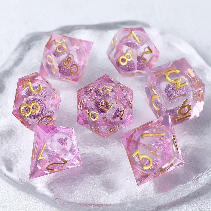 Embrace the Magic of Romance and Grace! The "Rose Quartz Shimmer Dice" set is a charming liquid core collection, crafted for adventurers with dreams and warmth in their hearts. Each die is steeped in clear, translucent pink resin, with a core containing swirling rose-pink glitter that looks like a vortex of gentle, romantic magic or the concentrated essence of blooming cherry blossoms.