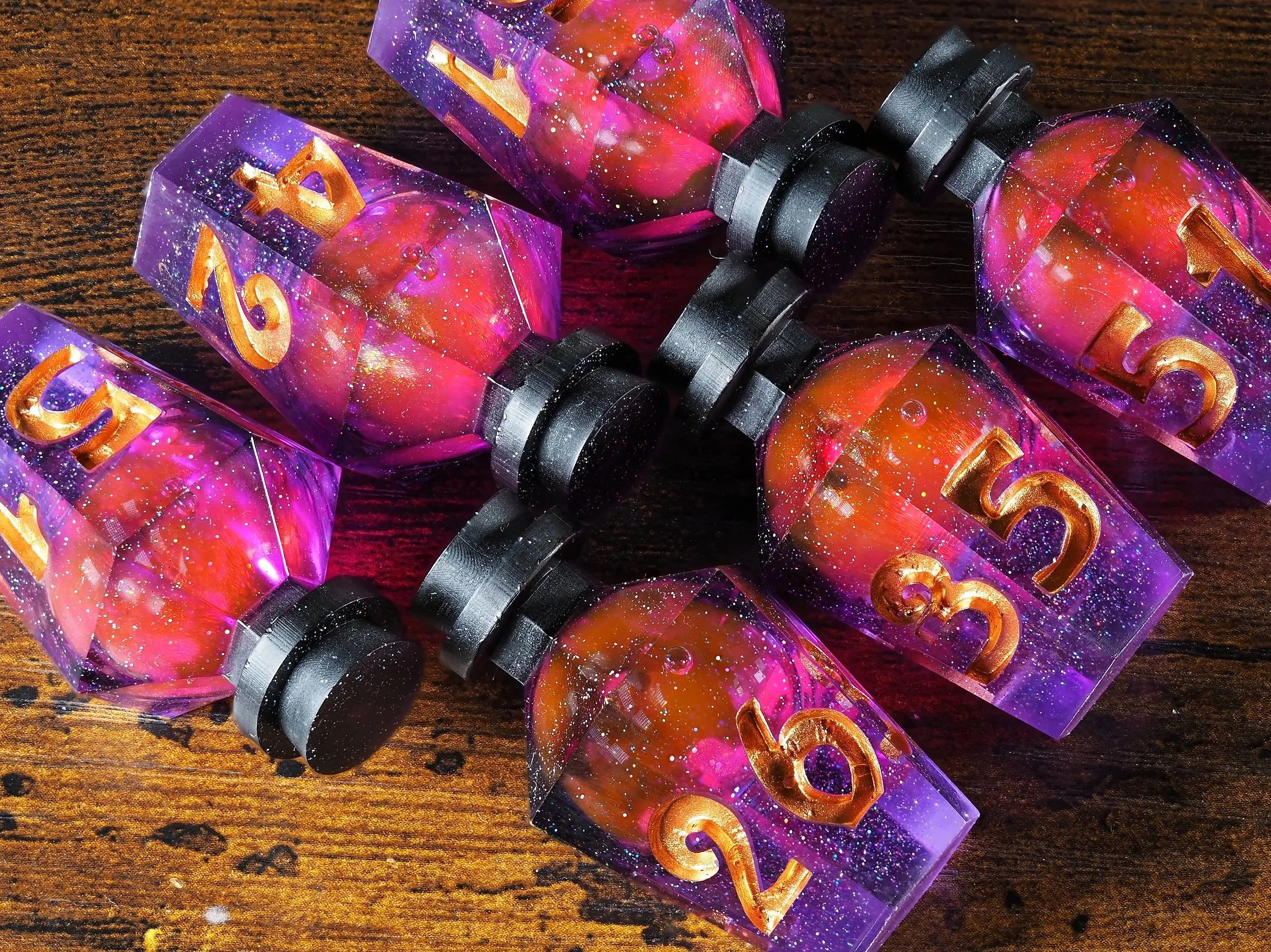 Each die is crafted into a mystical vial-shaped potion, its outer shell a noble and deep amethyst color, as if absorbing shadowy energy from the abyss. The true spectacle lies at its core: flowing, molten red sand, shimmering with fiery gold.