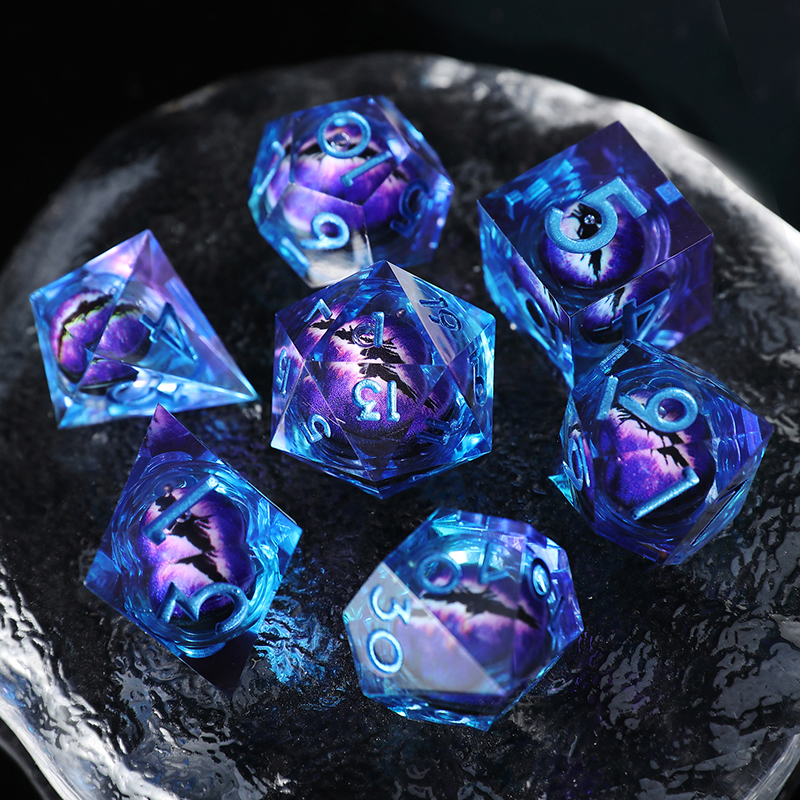 Each polyhedral die is meticulously crafted from crystal-clear, brilliant blue-hued resin, encasing a stunning, mysterious purple-black dragon eye at its core. Utilizing "Liquid Core" technology, the eye appears to come alive with every roll; it slowly shifts and glares from within the deep blue luminescence, like the penetrating gaze of a colossal dragon emerging from a distant abyss. Every toss is imbued with ritualistic power and unpredictable magic.