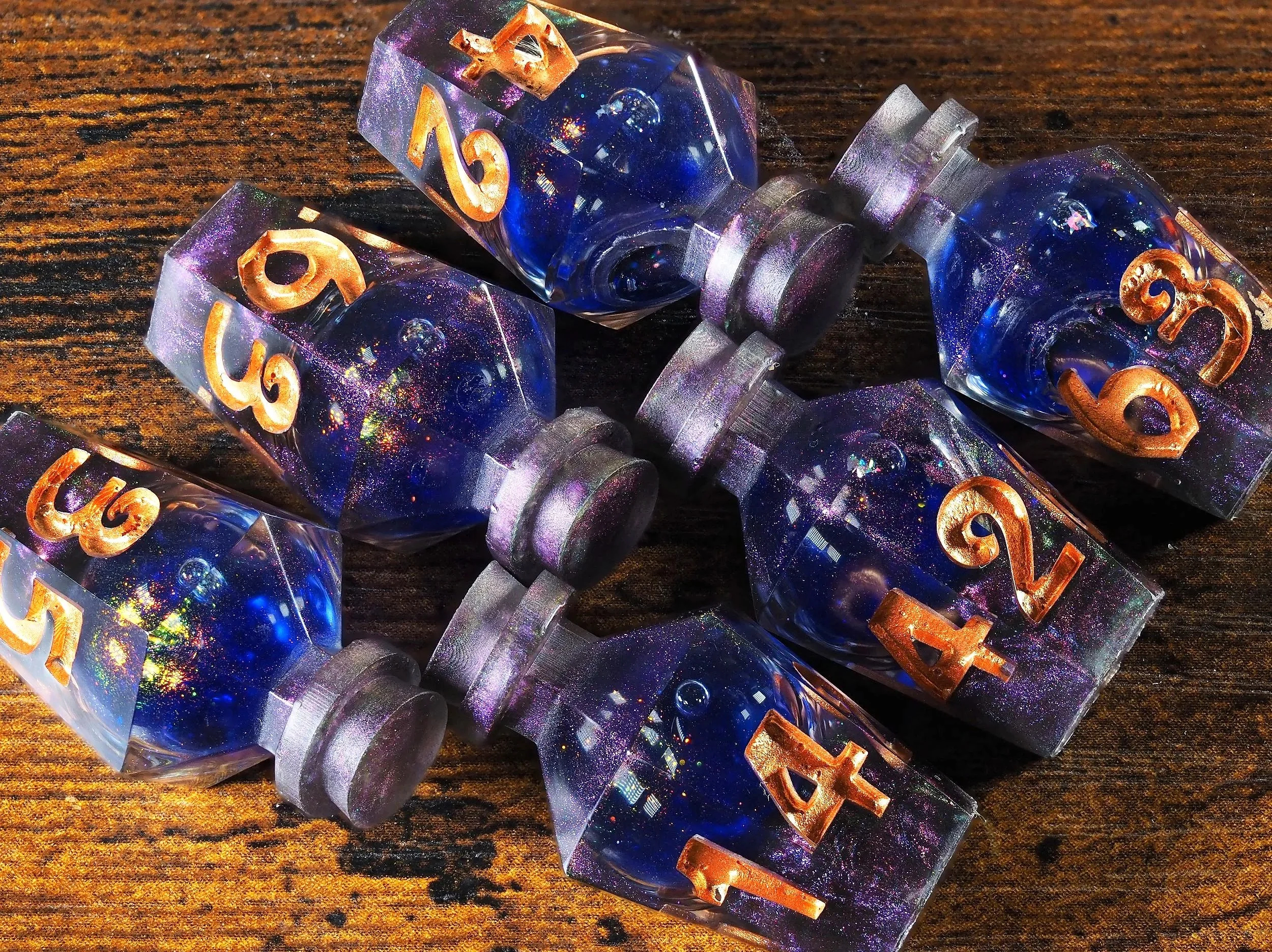 Explore the mysteries of the universe and let your destiny be guided by the stars! This **[Star Alchemy] quicksand dice set** mimics a mysterious alchemist's potion bottle, with a purple casing exuding an aura of nobility and magic. At its core is a deep blue-purple quicksand, and with each roll and shake, the starlight within shimmers and flows, as if a miniature nebula were sealed inside. Paired with clear and fantastical gold numbers, your results will be easily visible even in dark dungeons or intense battles. They are not only the perfect tool for tabletop role-playing games (TRPGs) but also a stunning magical collectible for your desk.