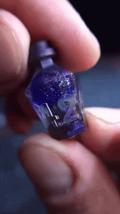 Each potion bottle is infused with deep purple-blue resin and shifting, colorful quicksand. A gentle shake unleashes a cosmic storm within, its shimmering movement resembling flowing arcane energy. Clear numbers are engraved on the side of the bottle, ensuring accurate predictions.